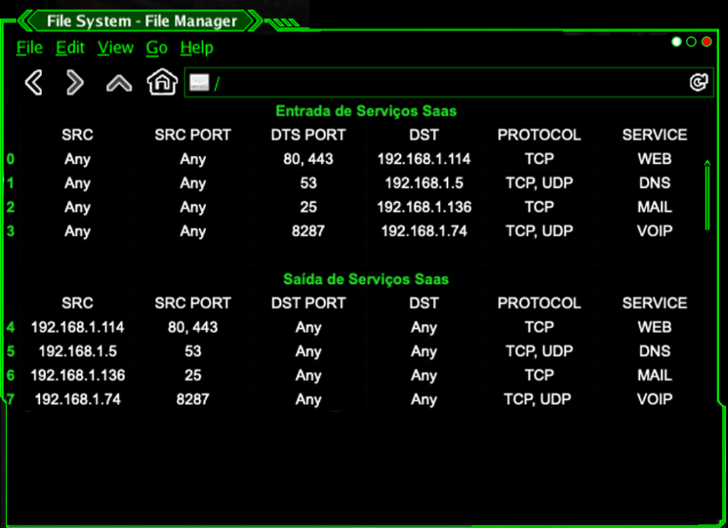 Regra 0 – Garante que quando a origem seja a rede interna de computadores, para o IP do servidor web consiga realizar requisições nas portas HTTP e HTTPS, utilizando o protocolo TCP. A regra  7 garante que apenas as  informações destas requisições possam retornar.