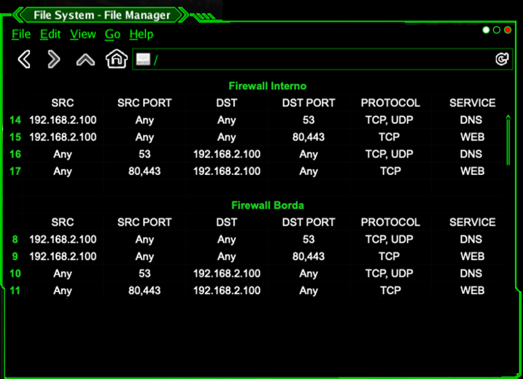 As regras do firewall interno garantem que apenas esta estação consiga realizar solicitações para a  internet, e como não temos nenhuma regra que permita a saída destes pacotes na borda, repetimos as mesmas regras, especificando apenas o IP da estação, assim evitando maiores falhas de segurança, como liberar a rede toda, mesmo com um segundo firewall abaixo.