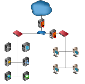 Para este exemplo de Firewall vamos utilizar uma organização extremamente rígida em termos de acesso, esta organização possui várias camadas de segurança, entre elas, dois Firewalls, para assim criarmos uma DMZ (Zona Desmilitarizada), ou seja, os servidores com aplicações que terceiros utilizem, ficam uma camada abaixo da rede interna.