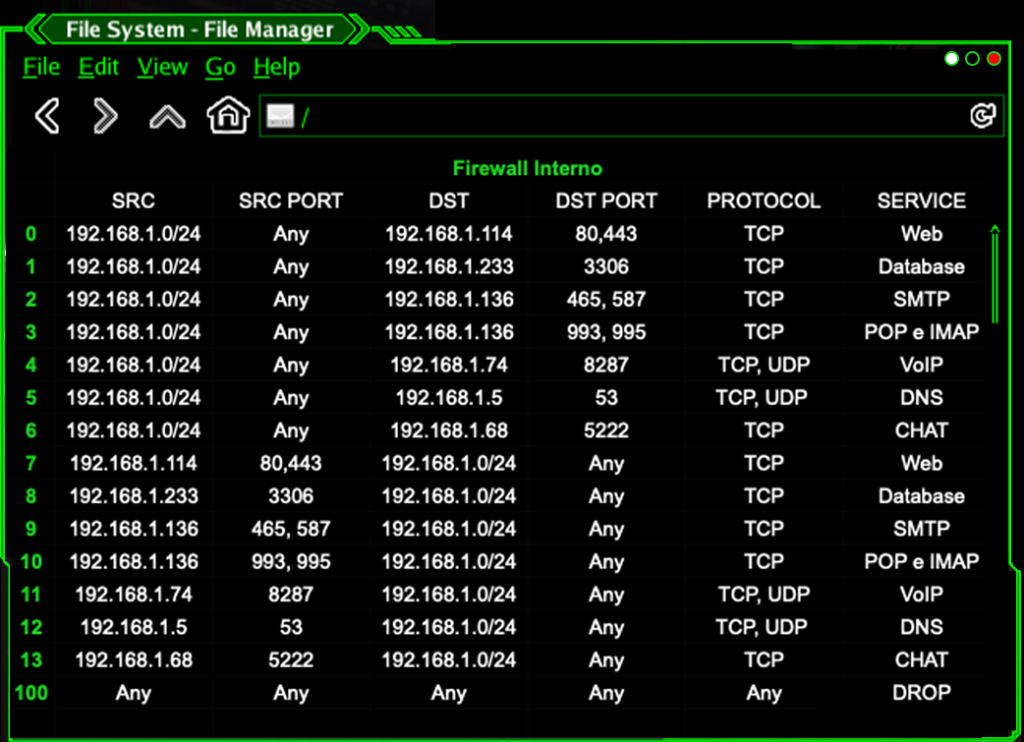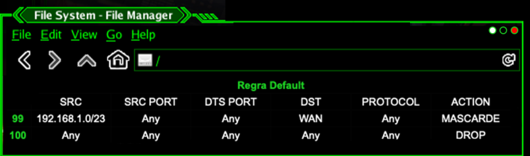O firewall funciona com regras por índices, ou seja, ele verifica se a solicitação atende a regra 0, e assim sucessivamente, não havendo nenhuma em que a solicitação se encaixe, o pacote é descartado. Nestes casos criamos uma regra default, a última, caso nenhuma das anteriores atenda a solicitação, realiza-se o Drop do pacote.